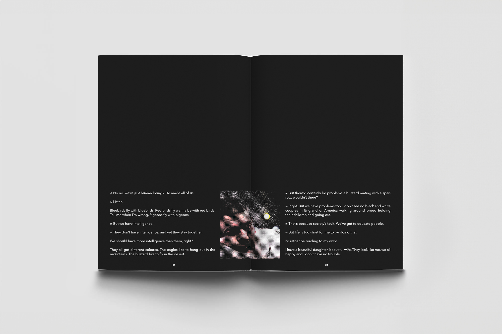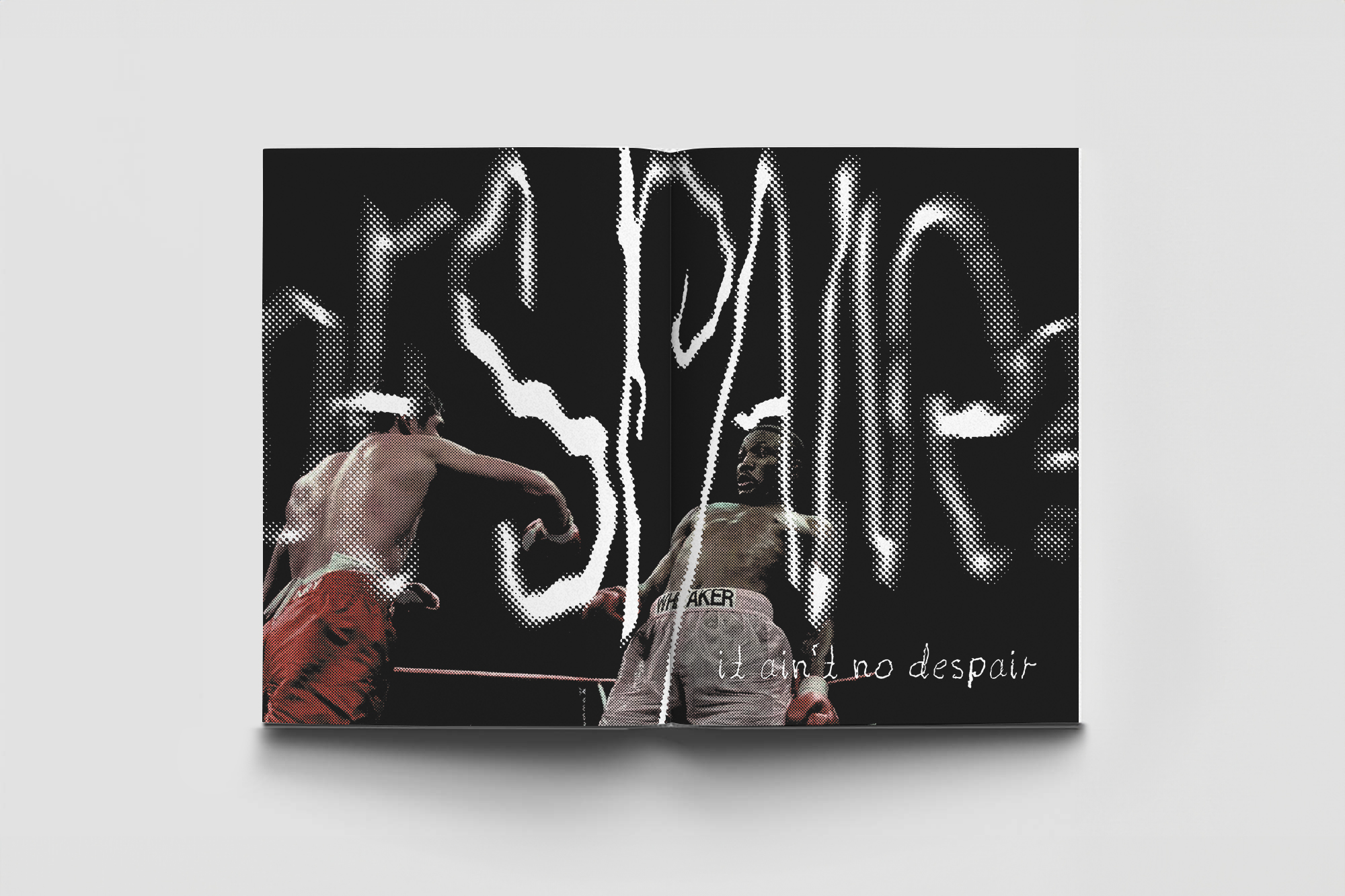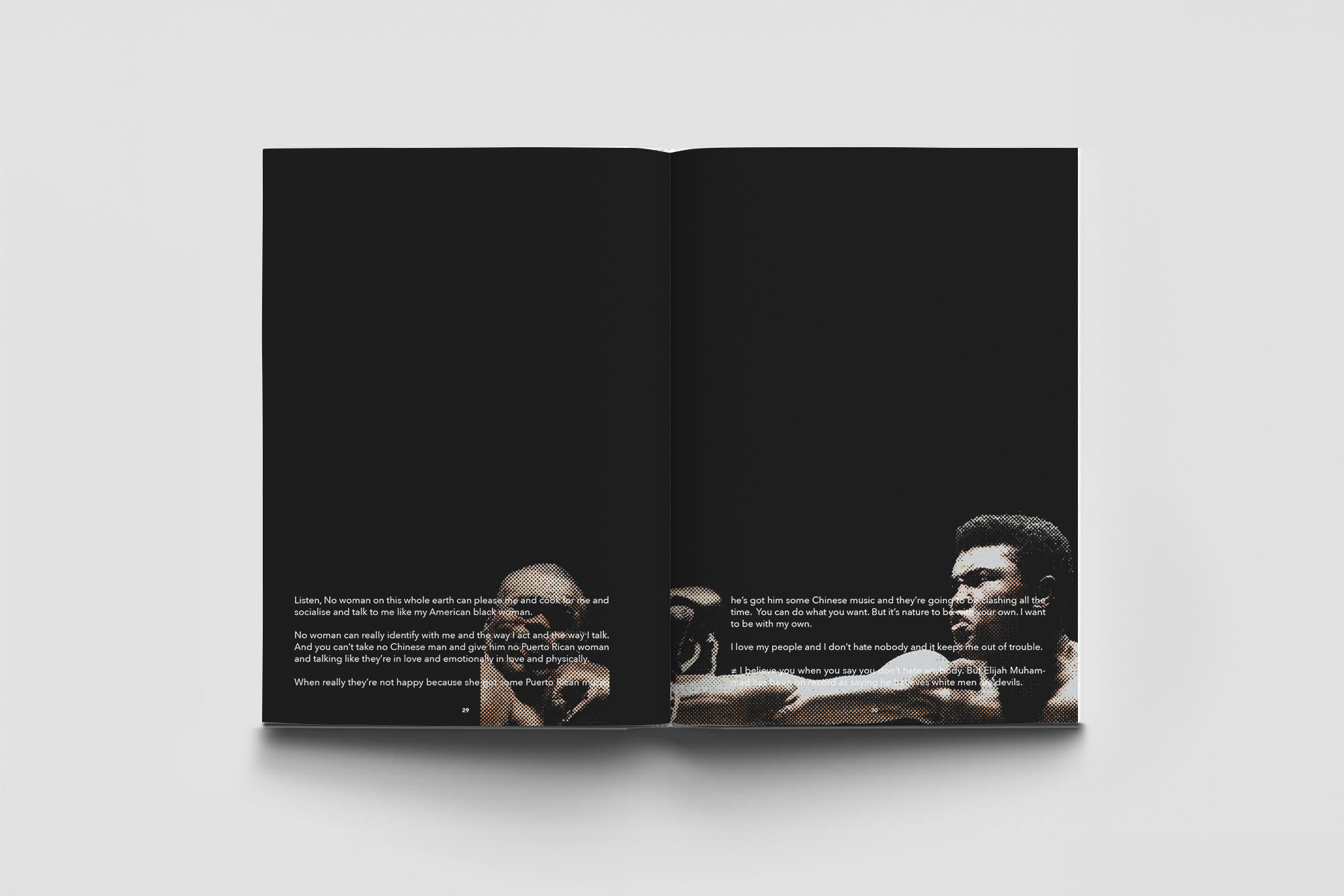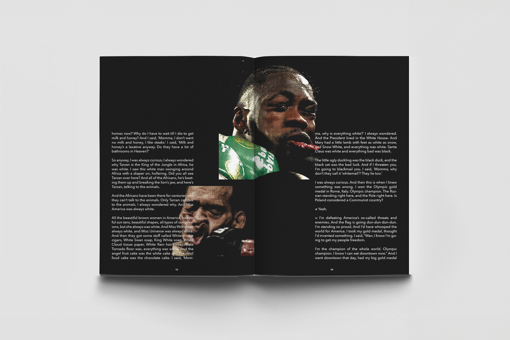 This photobook mirrors the shift in tone of Muhammad Ali’s 1971 interview with Michael Parkinson, which begins with lighthearted banter and transitions to serious discussions on civil rights and racism.