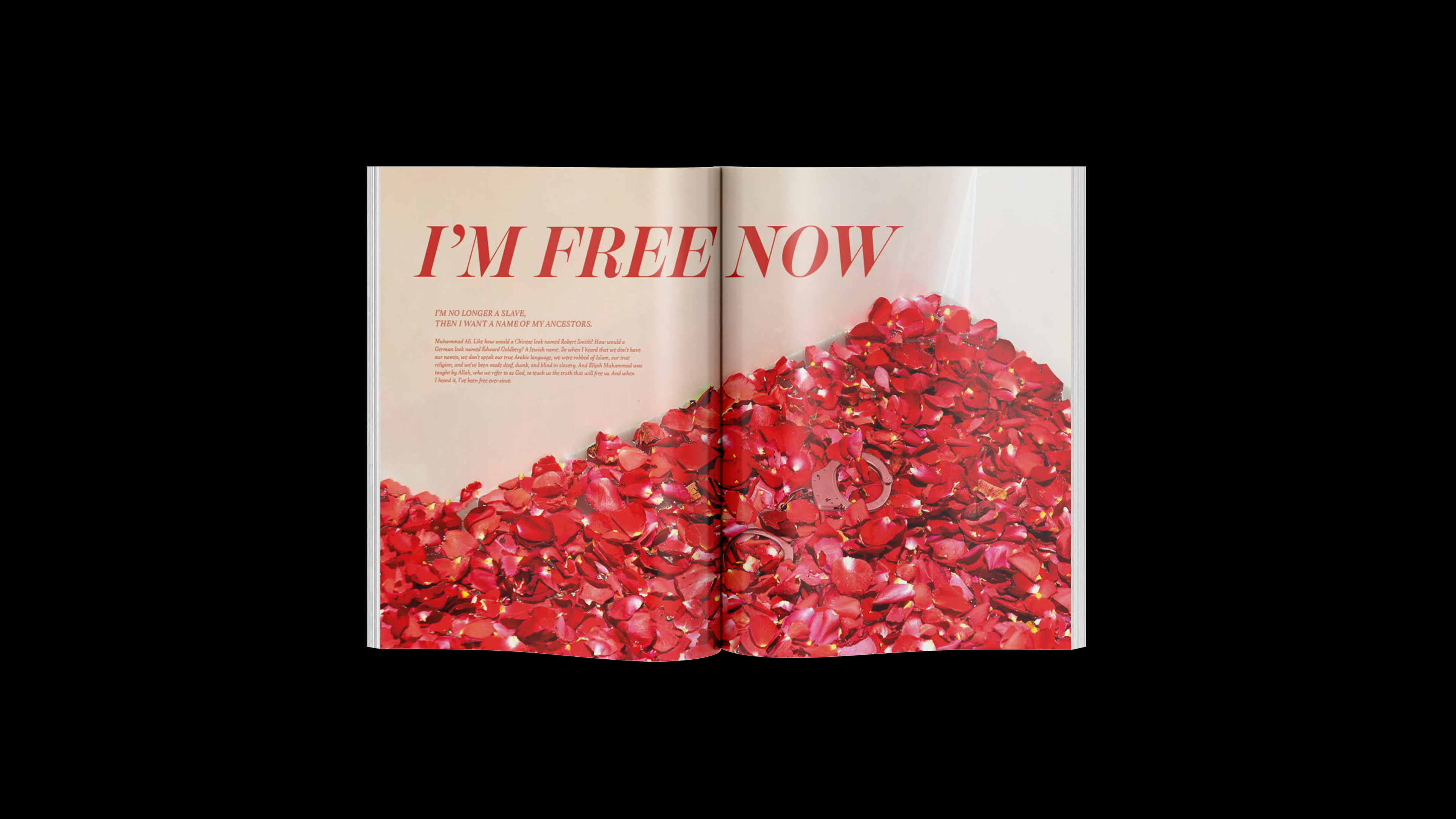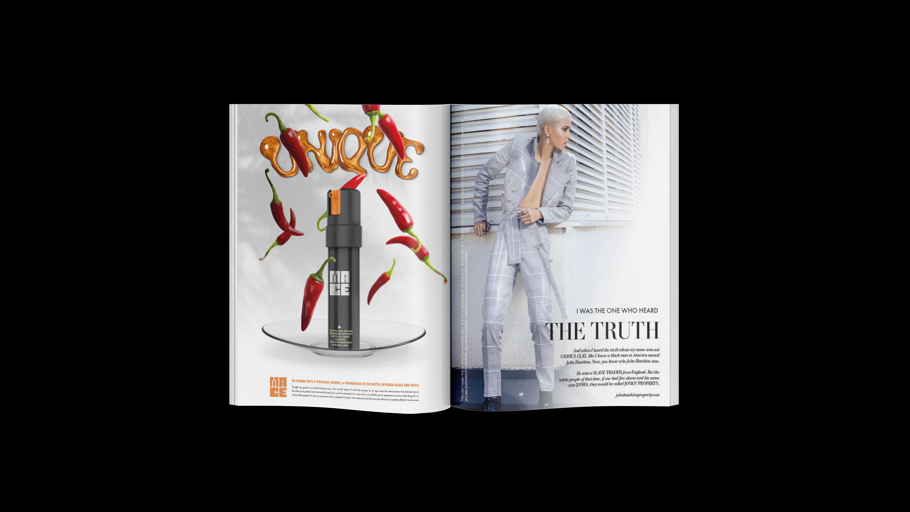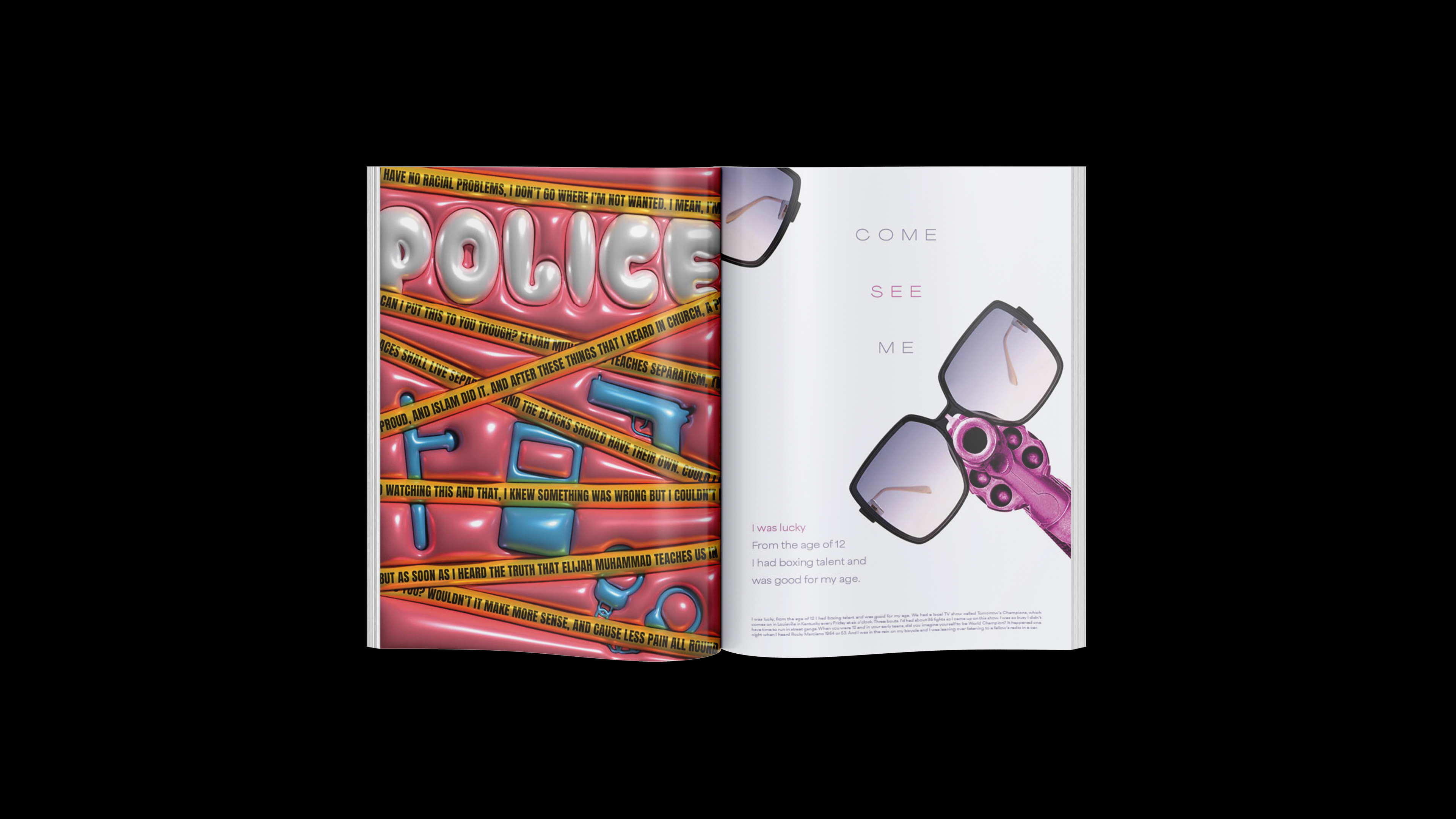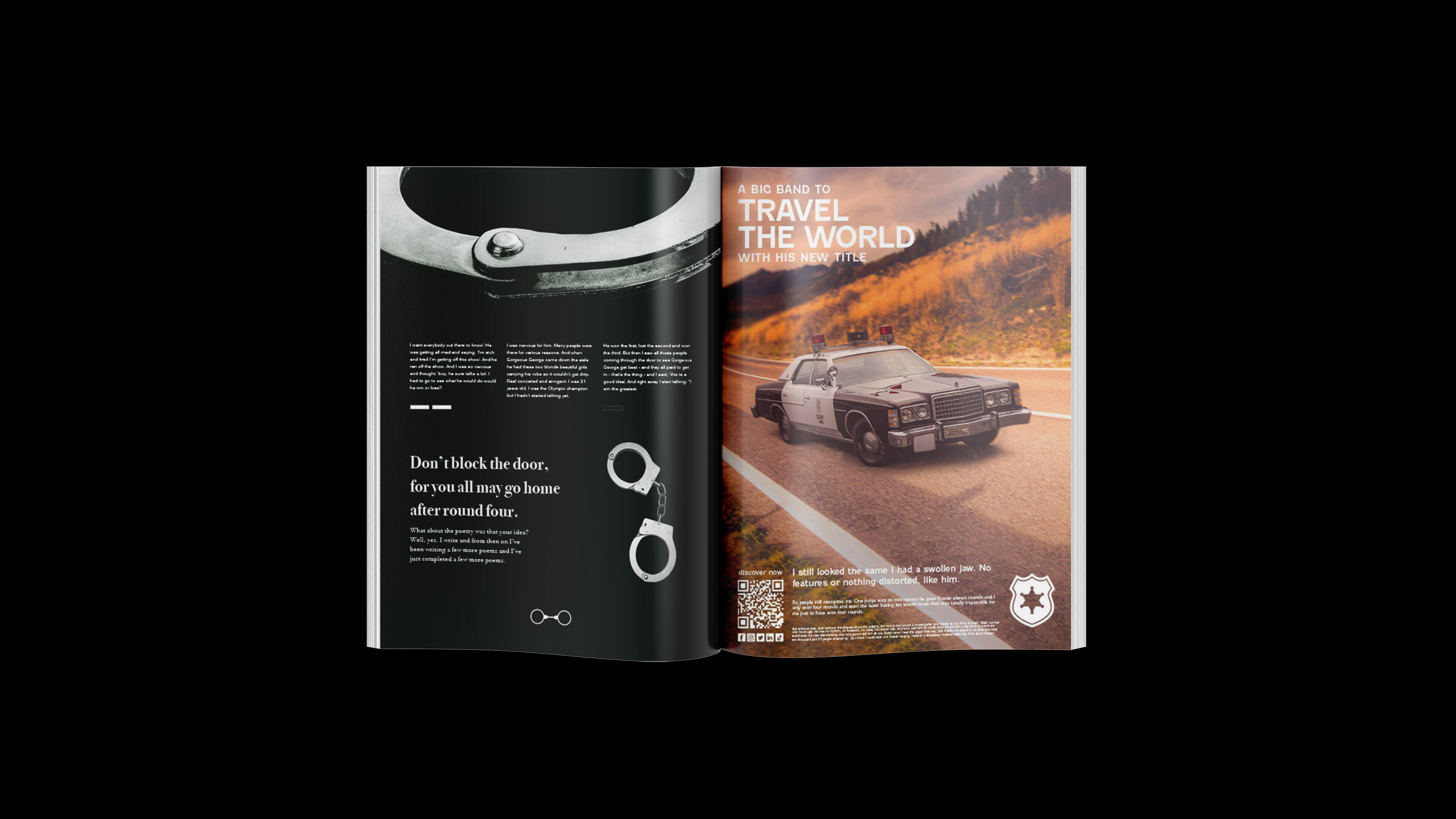 This perspective mimics a high-end magazine, with advertisements subverted to highlight tools of oppression, styled as luxury products. This unexpected twist draws readers in with familiar visuals, only to confront them with the harsh realities of civil rights struggles. It mirrors Ali’s blend of humour and gravity, evoking emotions from shock to empathy, and making the issues he discussed deeply impactful and resonant with his activism.